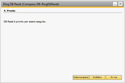 Oltre ai dati verranno eliminati i seguenti oggetti di Ring: tabelle utente, campi utente, UDO, stored procedures, autorizzazioni supplementari, formatted search, query.
